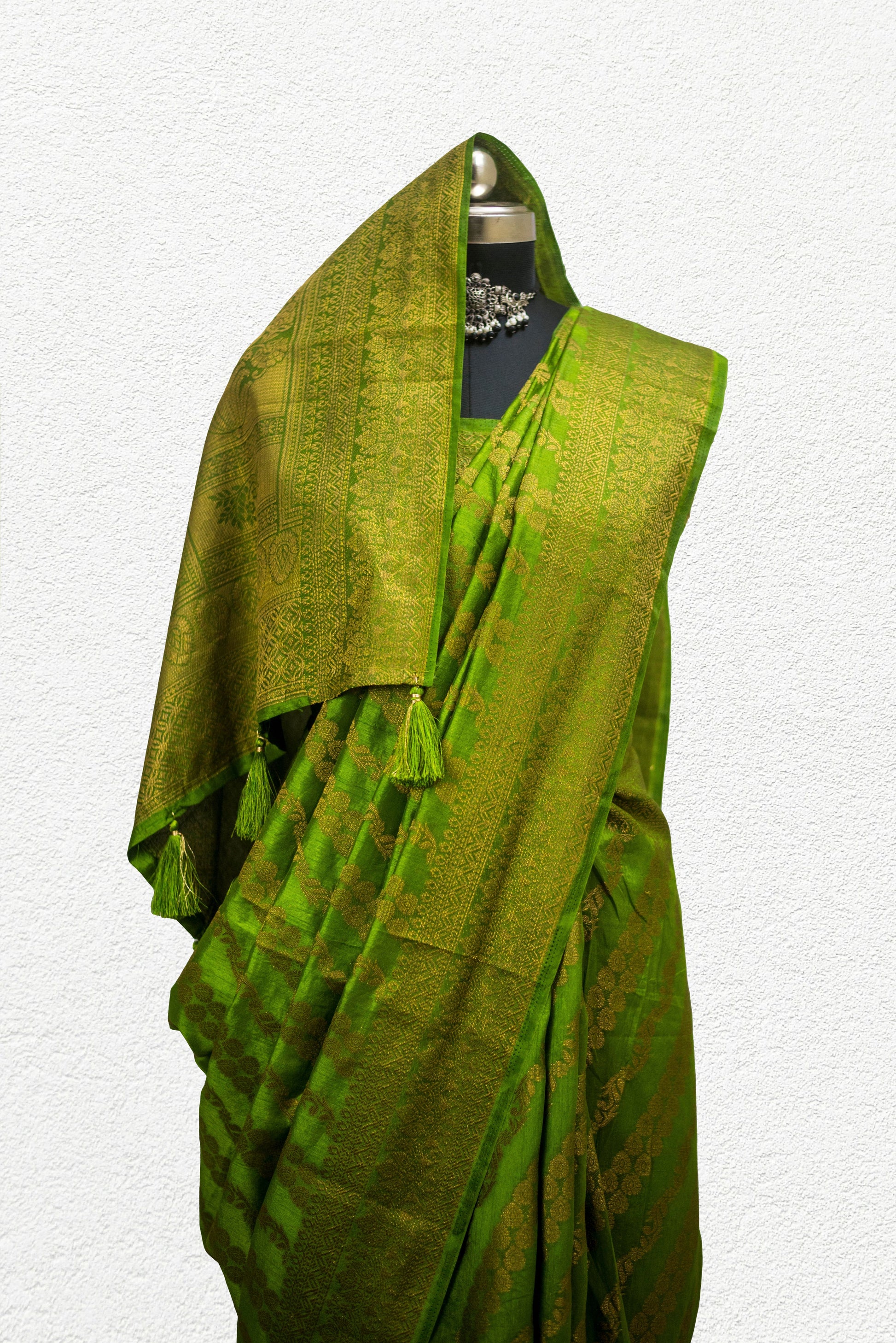 The rich, opulent silk blend fabric offers a beautiful sheen and a graceful drape, while the all-over intricate woven zari work and shimmering border add a touch of traditional grandeur. The lush, festive Mehendi Green, makes a captivating statement.